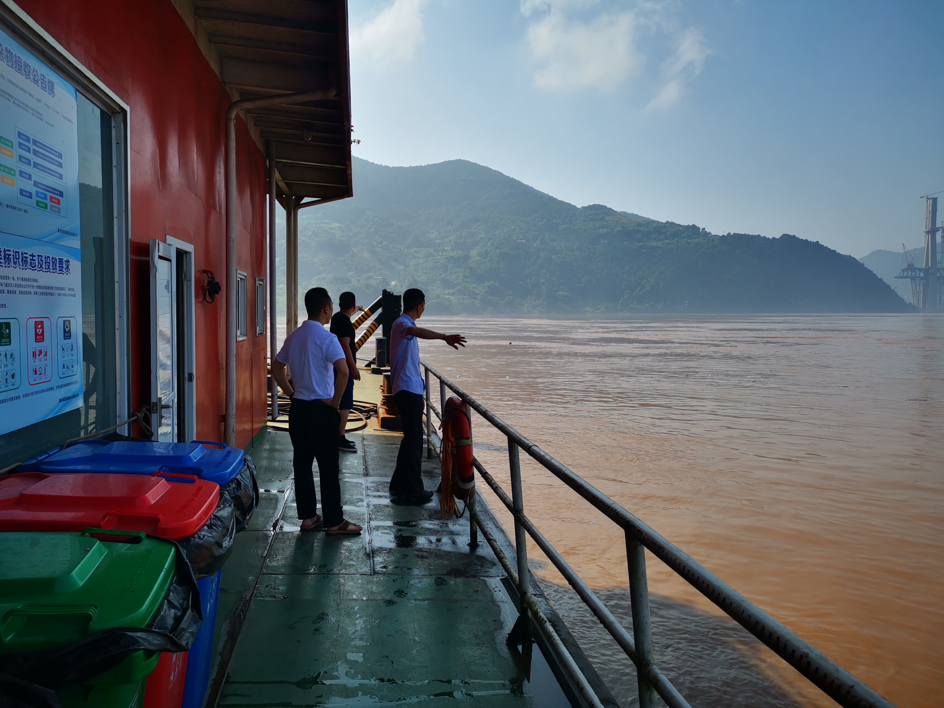 7月28日8时,寸滩水位180.28米,入库流量43100m³/s。迎着晨曦,安全生产部组织运营部及多名船长来到沉静中的果园滚装码头,现场查勘水势和水深。洪峰才刚刚过去,水位高位中缓退。果园滚装码头水势复杂,大量翻滚的水泡、溪流夹着着大量漂浮物对船舶的靠泊和船舶安全构成了巨大的考验。